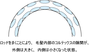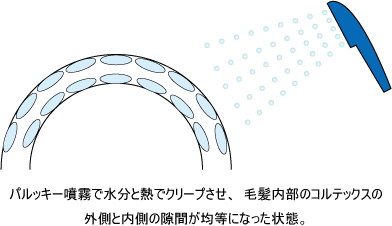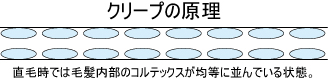 クリープとは、パーマ施術時の段階で毛髪内部をゴム状にして、ロッドを巻いた状態で コルテックス(タンパク)の配列を均等に配列させ、形状記憶させることで、パーマ時の髪へのストレスを軽減し |